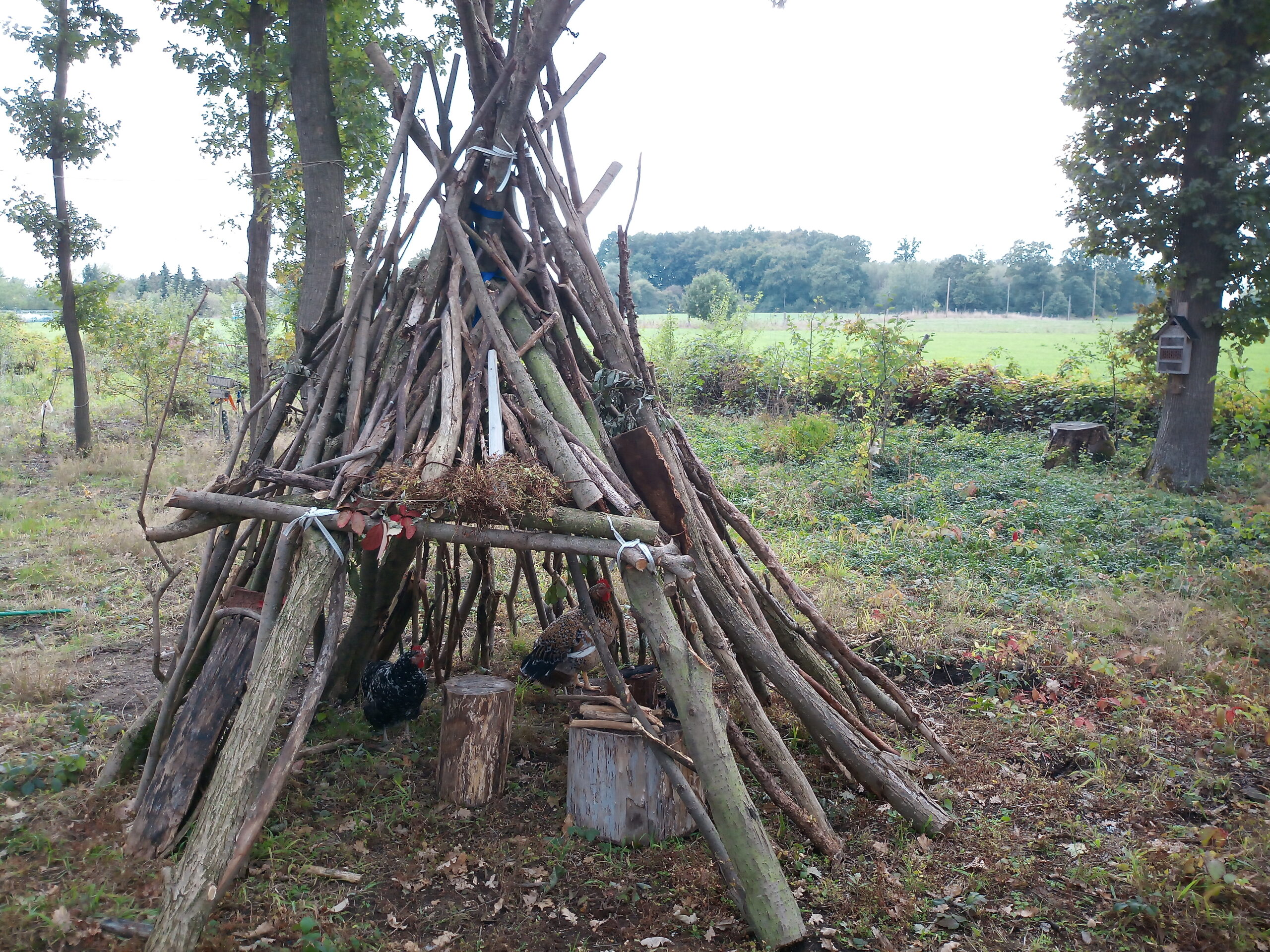 Zusammen mit den Kindern haben wir ein Tipi gebaut, das scheinbar auch die Hühner begeistert